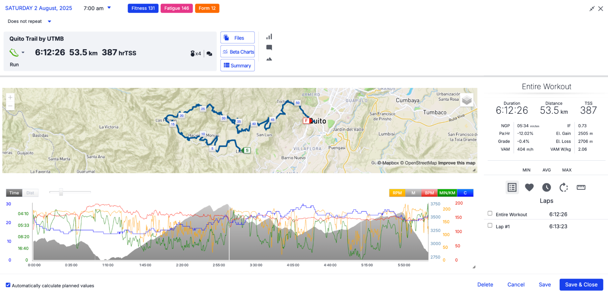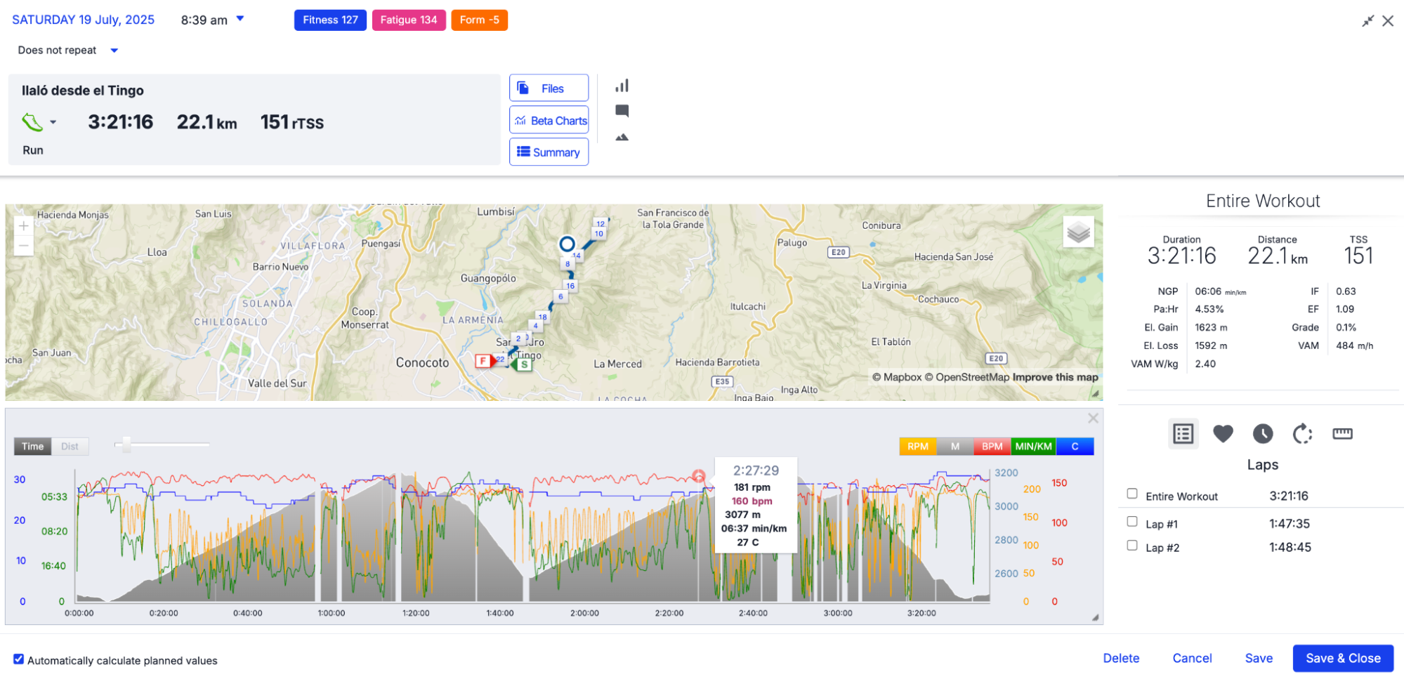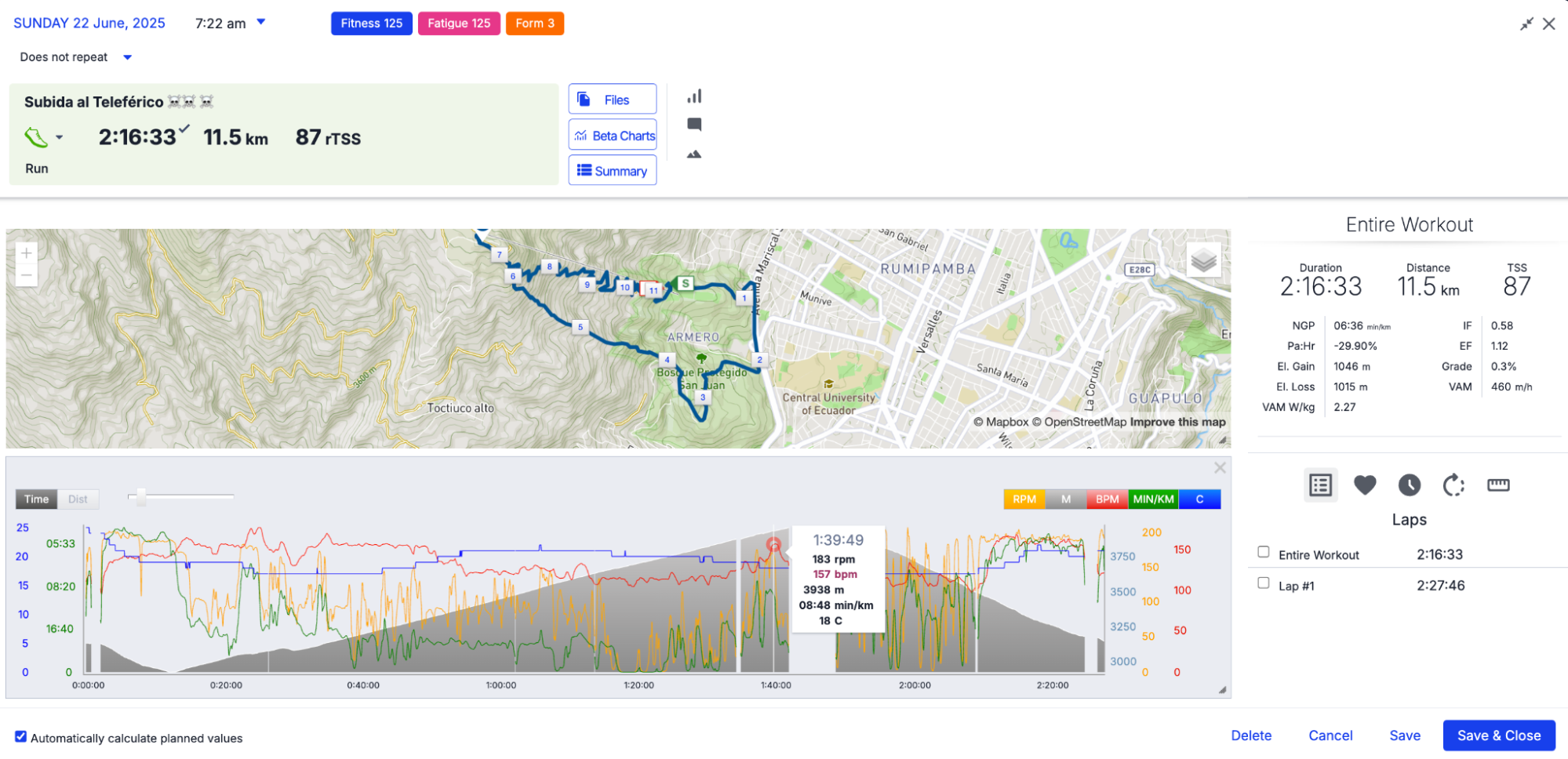 - Sesiones de desnivel: entrenamientos como la subida al Teleférico (11,5 km / +1046 m / 2h16) y el ascenso al Ilaló desde El Tingo (22,1 km / +1623 m / 3h21).